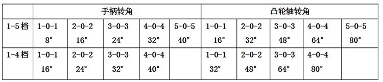 (3).檔位選定:XKDF檔位有1-5檔,手柄轉角1-0-1 12°;2-0-2 18°;3-0-3 24°;4-0-4 30°;5-0-5 36°.齒輪付增速比i=3.25,與手柄轉角對應的凸輪軸轉角(凸輪軸裝有凸輪片)為:39°,58.5°,78°,97.5°,117°。